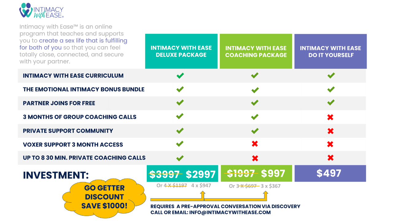 Intimacy With Ease is not just a description of the problem and what’s got you stuck; it’s an implementation program that walks you through a process where you can change your experience.